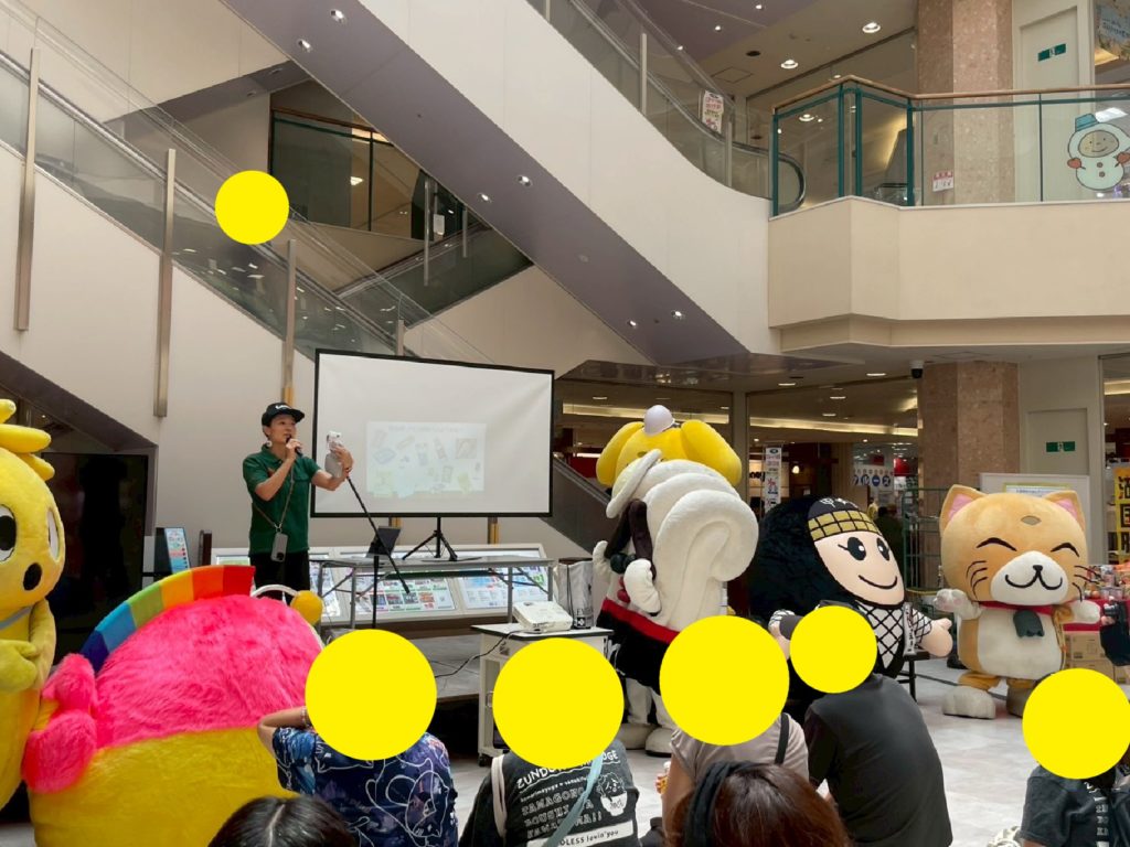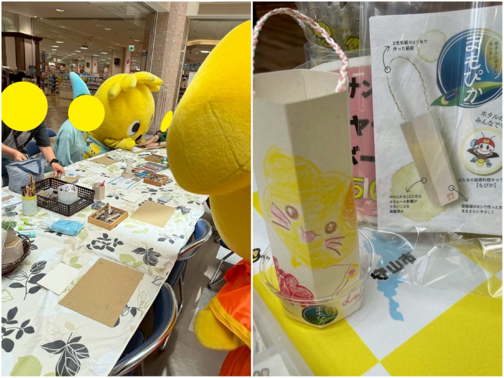 会場では(公財)日本公衆電話会さんにご参加いただき、災害用伝言ダイヤル「171」や公衆電話の使い方を来場のお客様に体験していただきました。守山市で《ホタルにやさしいランタン作り》をされている「まもピカ」さんも会場でワークショップを行い、キャラさん達と楽しくランタン作りをされました。